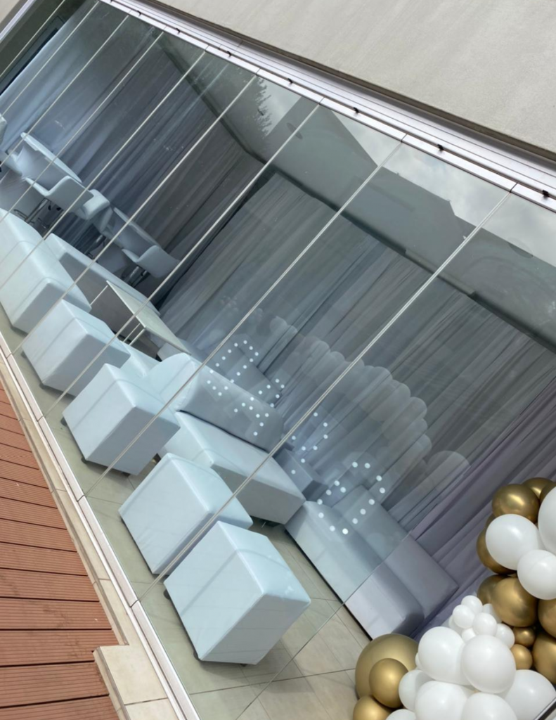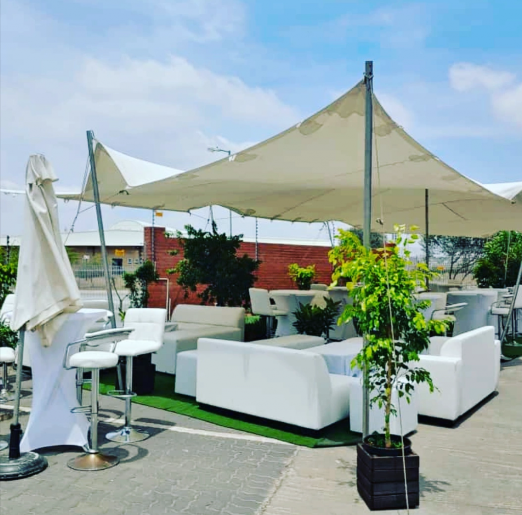 Hire event furniture, stretch tents, tables, draping, cocktail tables, umbrellas, and white couches for weddings, parties, and corporate events in Johannesburg and Pretoria.